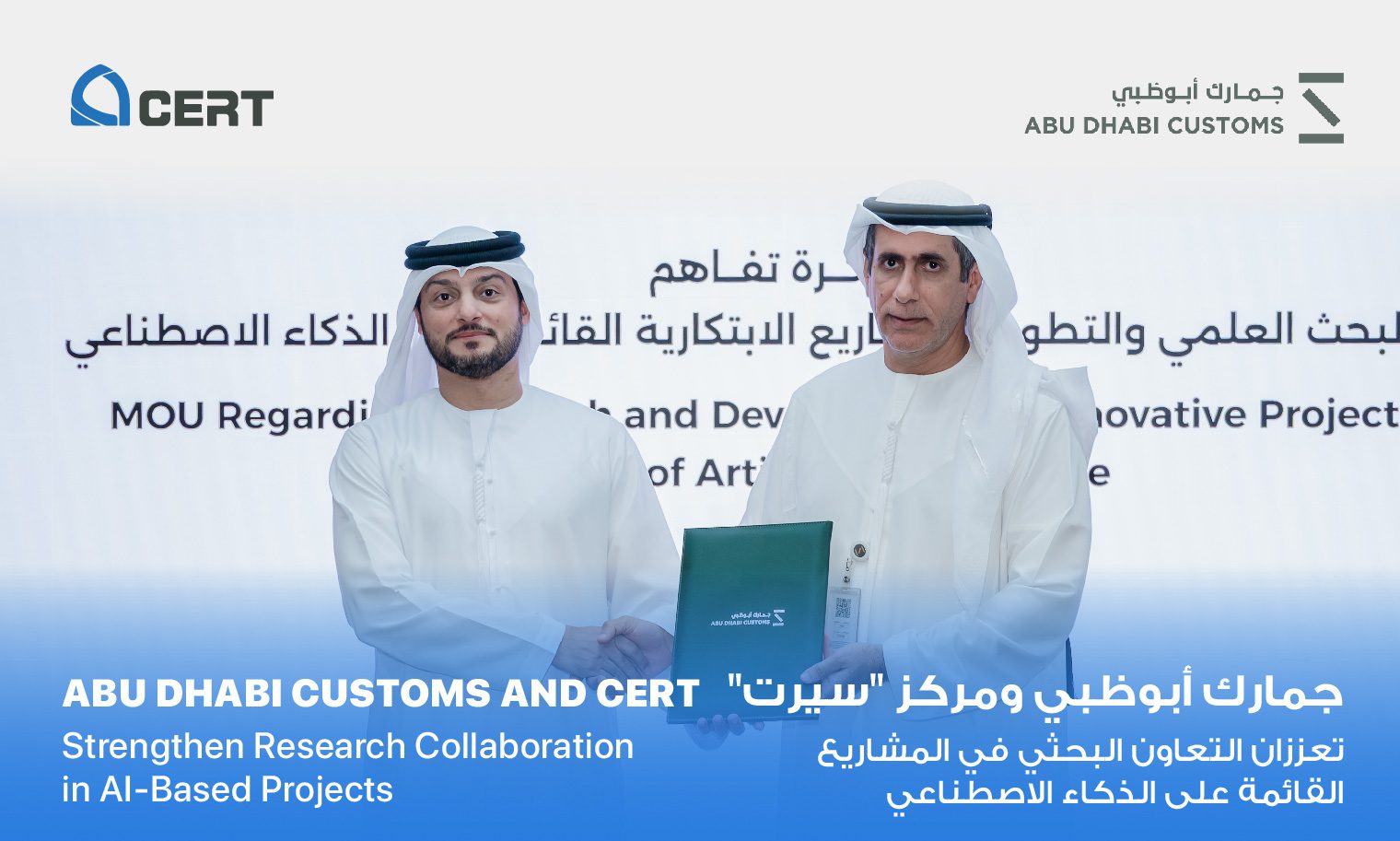 جمارك أبوظبي: أبريل 2026 –أبرمت جمارك أبوظبي ومركز التفوق للأبحاث التطبيقية والتدريب “سيرت” مذكرة تفاهم تهدف إلى تعزيز البحث والتطوير في المشاريع الابتكارية القائمة على الذكاء الاصطناعي، وبناء القدرات الوطنية وتمكين الكفاءات في المجالات المستقبلية، بما يتوافق مع استراتيجية الإمارات للذكاء الاصطناعي 2031.